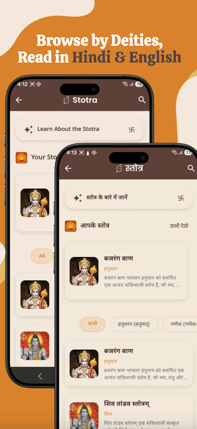 Access 1000+ Aartis, Chalisas, Bhajans, & Stotras in both Hindi & English language.